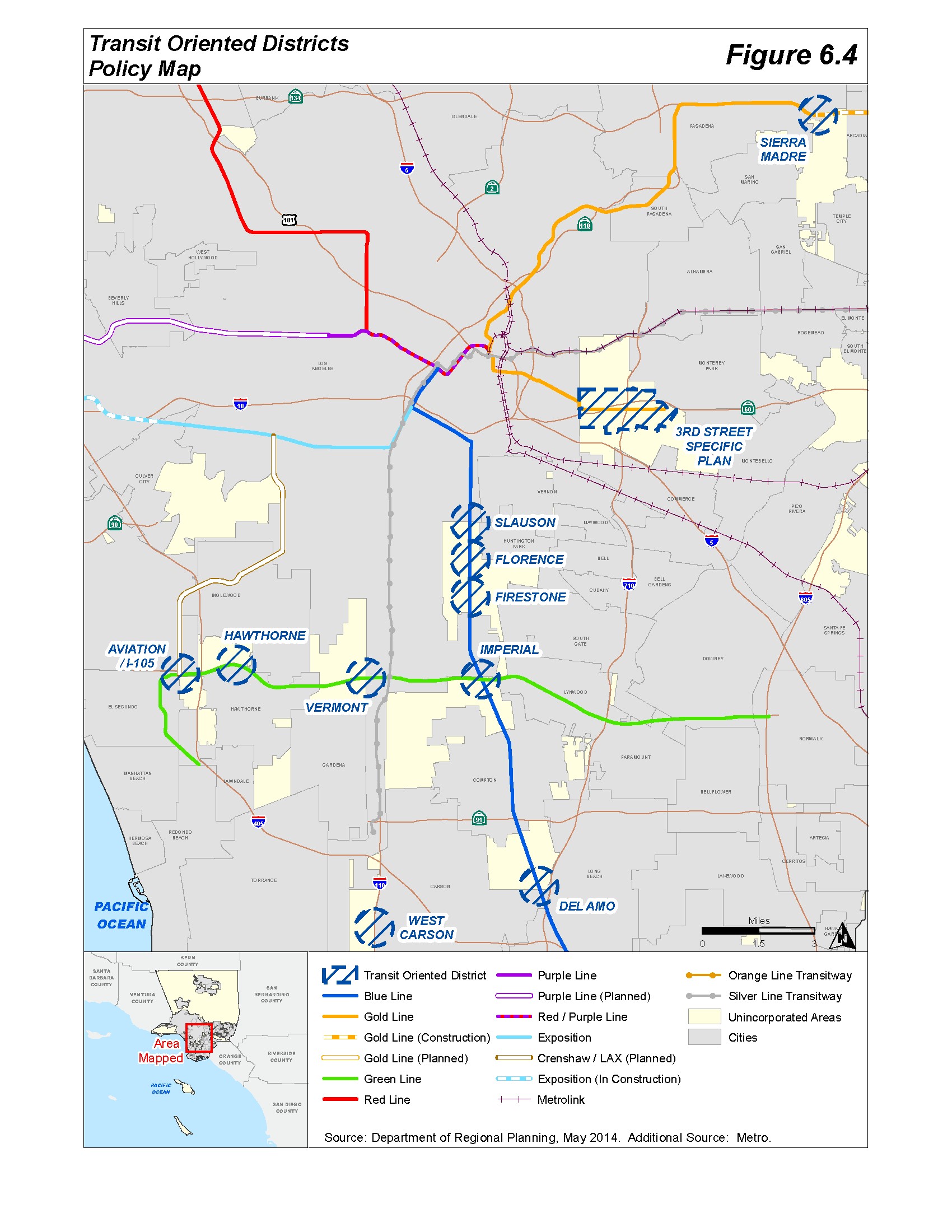 Description: This layer represents the proposed Transit Oriented Districts as depicted in Figure 6.5 in the General Plan 2035. These are urban and suburban areas with access to major transit and commercial corridors that have the most potential for infill development, and are well-suited for higher density housing and mixed uses. With the exception of the East Los Angeles 3rd Street Specific Plan, all of these are 1/2 mile buffers around a major transit stop.UPDATE HISTORY:10/18/18 - Updated for adoption of Willowbrook TOD Specific Plan which went into effect on this date.10/31/19 - Updated for adoption of West Carson TOD Specific Plan which went into effect on this date.7/1/20 - Updated for the adoption of the Connect Southwest LA TOD Specific Plan in West Athens - Westmont.3/10/23 - Updated for the adoption of the Florence-Firestone TOD Specific Plan.4/22/25 - Updated for the adoption of the South Bay Area Plan on 3/11/25 (effective on 4/10/25), adjusting the boundary of the West Carson TOD Specific Plan to include Alpine Village.